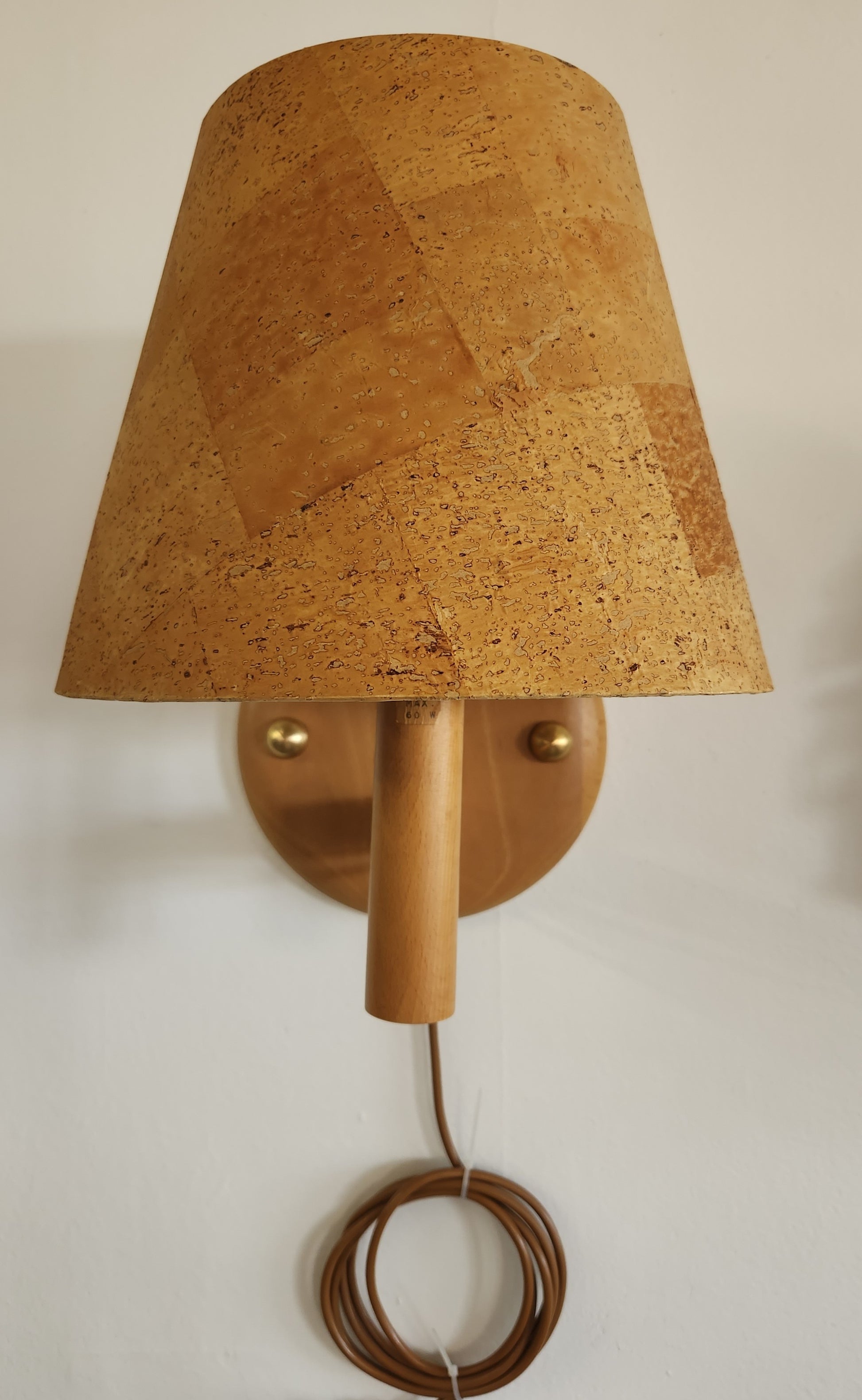 Beautiful Scandinavian wall sconce with a large Beech backplate & stem, topped with an oversized natural cork lampshade - so cool! Easily plugs into a socket, or have it hardwired if you prefer a cordless look. Classic Swedish design of the late mid-century. Missing the original hardware so I added the brass half-rounds to cover the screw holes.