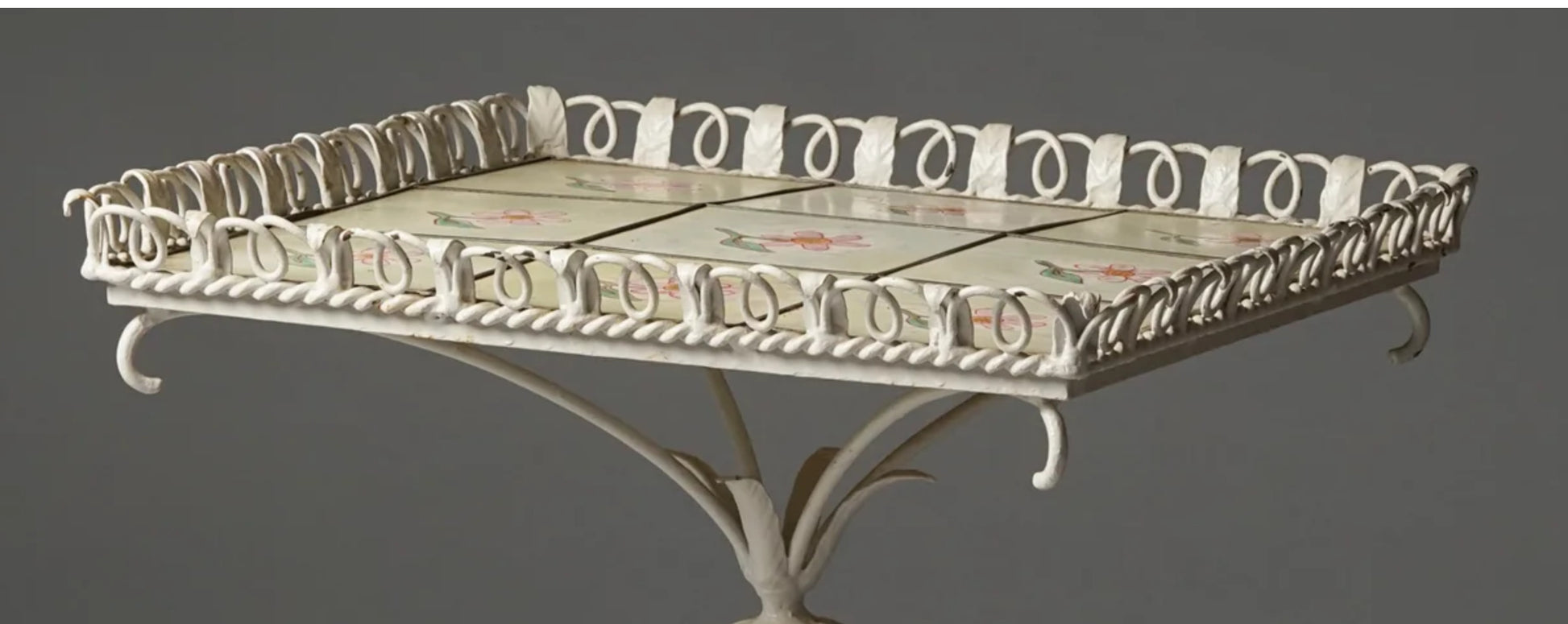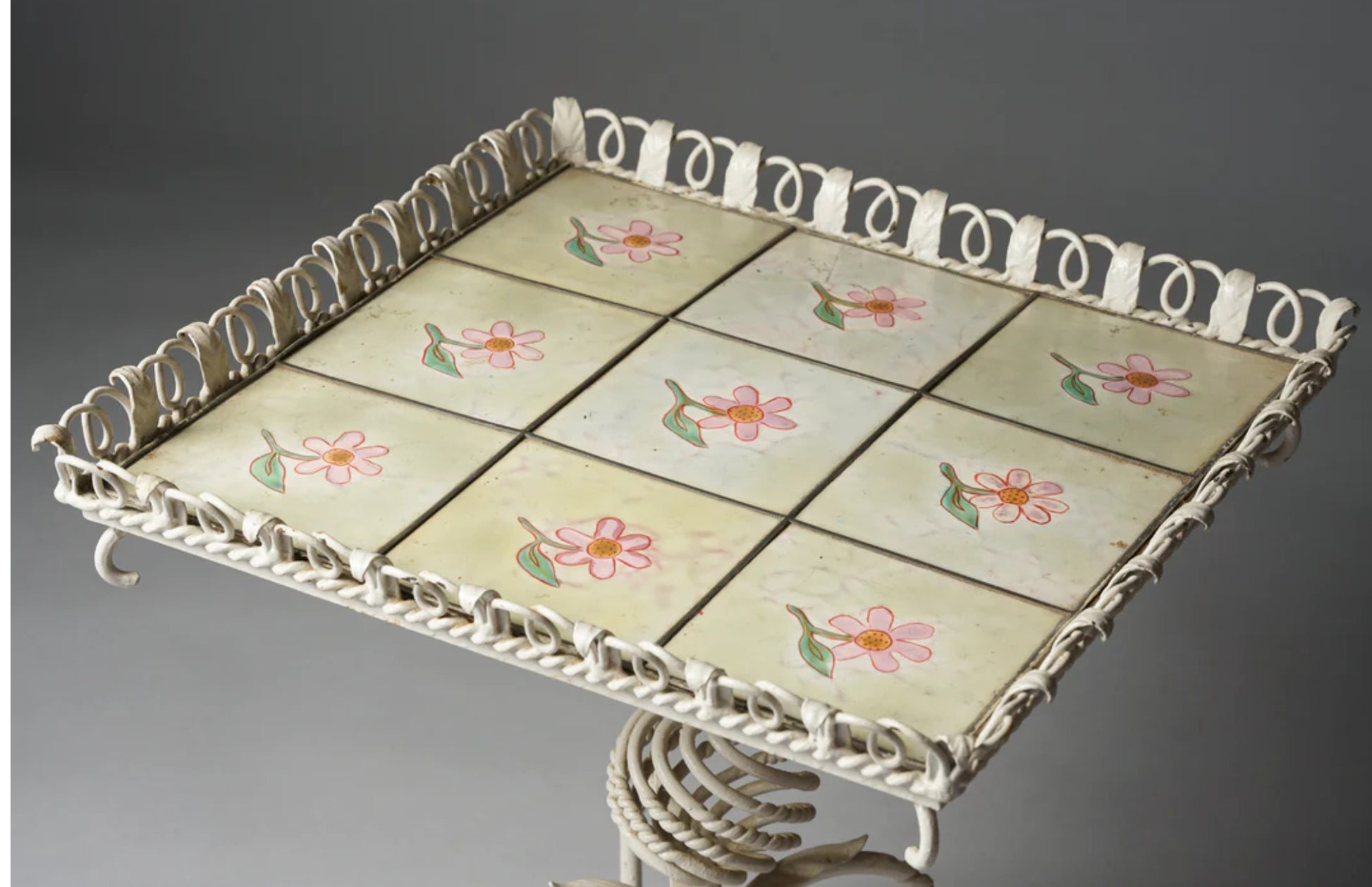 Incredibly rare and amazing table was designed by Antti Hakkarainen for Taidetakomo A. Hakkarainen in the 1930s. Handpainted tiles adorn the tabletop with pink and yellow flowers, and the glorious ironwork is a fantastic example of Antti's unparalleled craftsmanship. The gallery sides are elegantly designed with loop-de-loops, and he manipulated the iron into a twisted rope-like form that is absolutely fabulous. Beautiful patina, one cracked tile simply adds to its charm. Truly historic work of functional art.