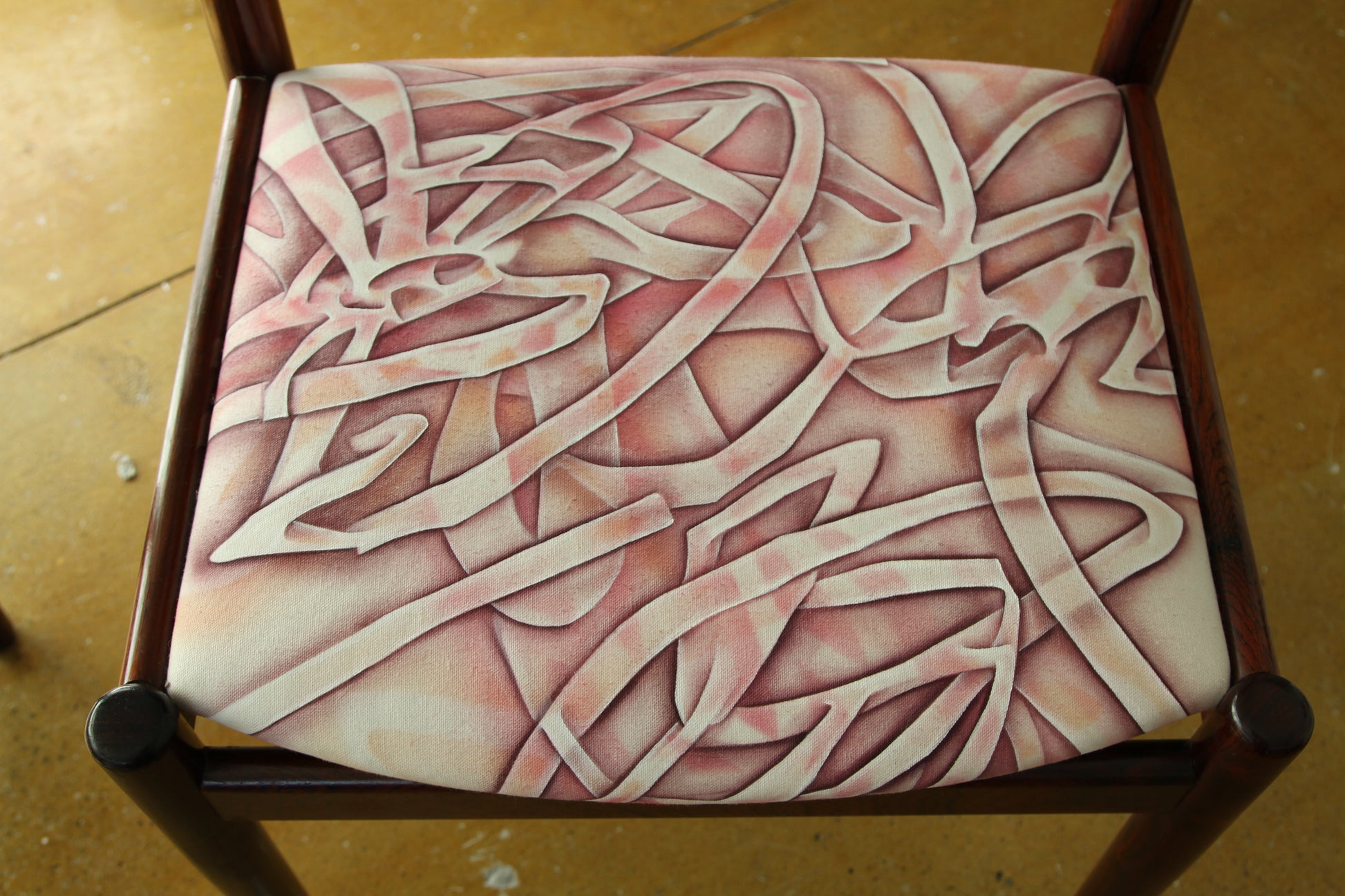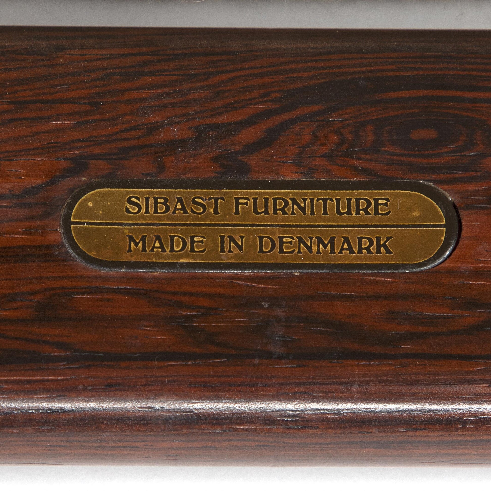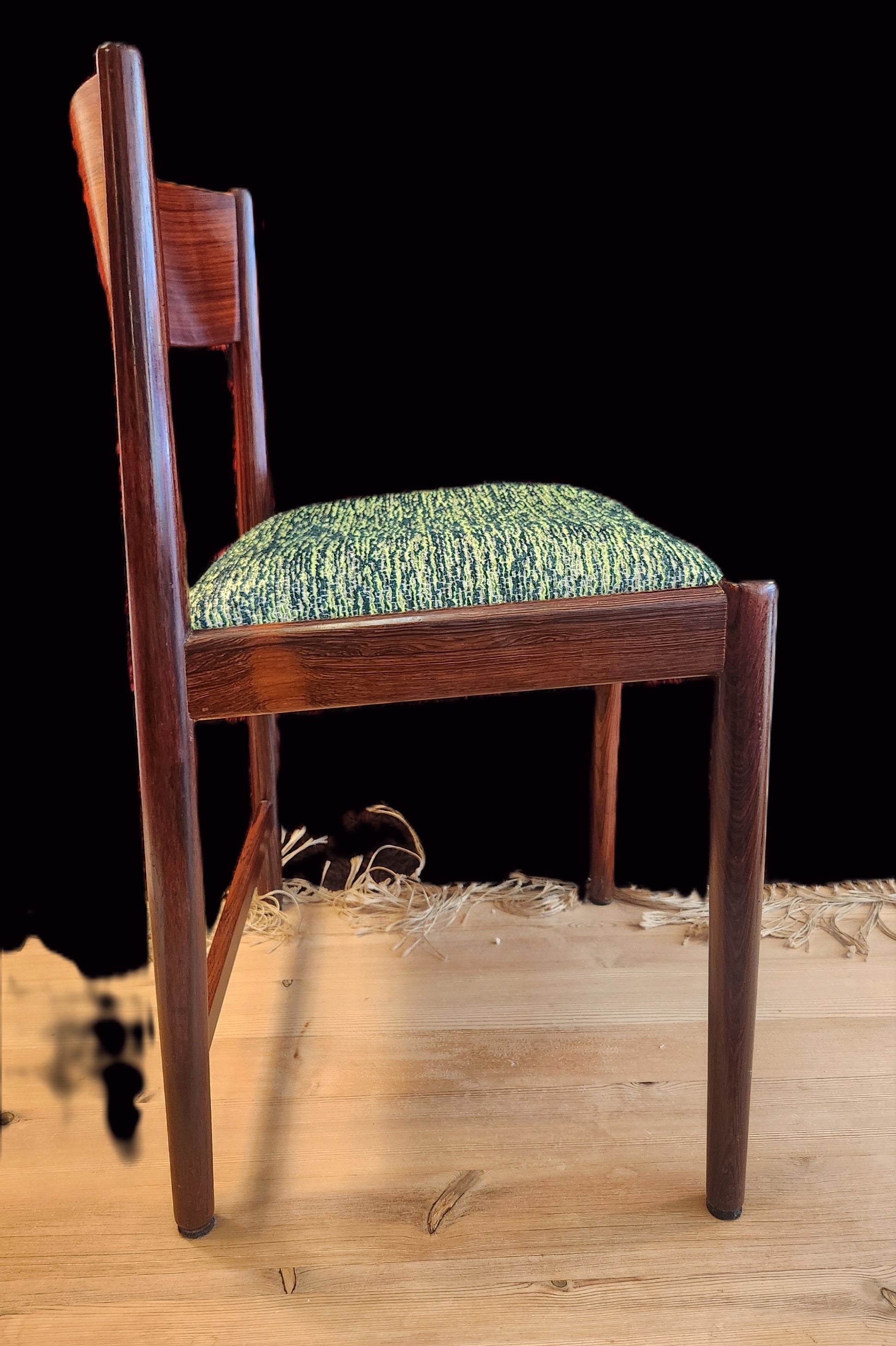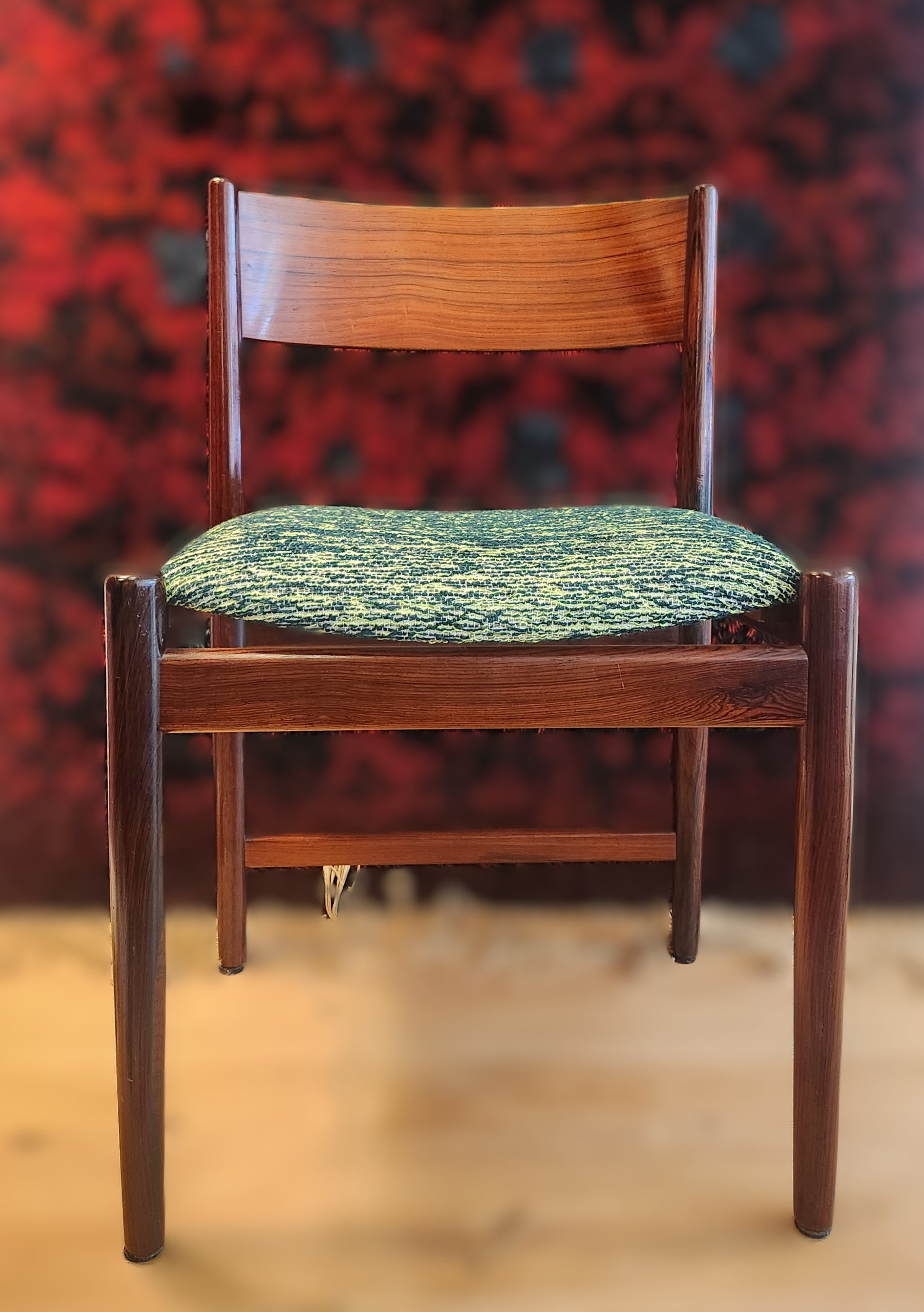 This set of six dining chairs is made from the most glorious rosewood. Rosewood is the world's most trafficked endangered species by value, you just cannot make them like this anymore. Absolutely gorgeous. Model 413. Manufactured and marked by Sibast Furniture. Six available: can be split into pairs upon request. Shown in a unique hand painted textile by Megan Olson. Now available in a custom textile by William Storm - hot green & black boucle! Custom upholstery also available. Priced Individually.