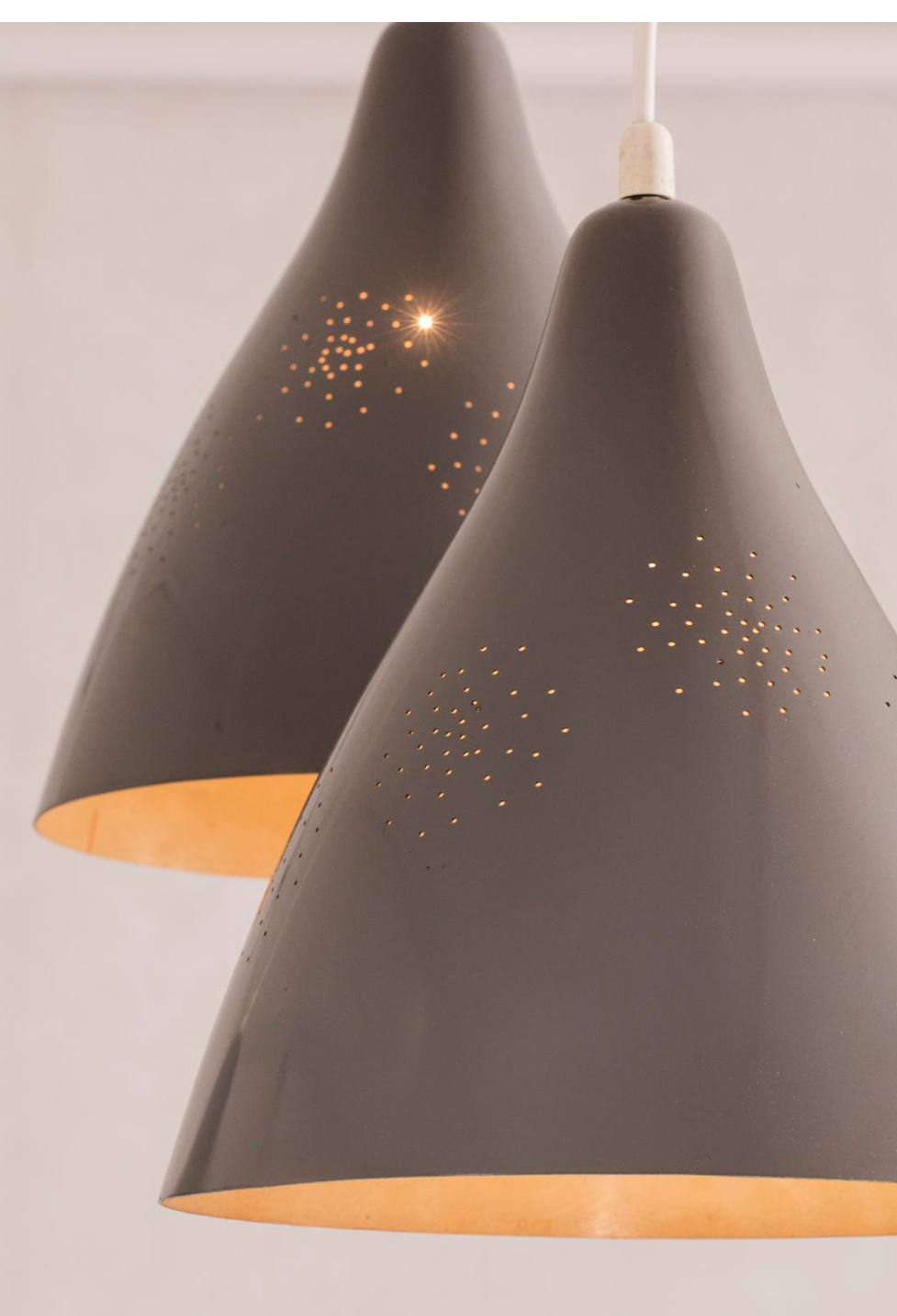 These pendants give off the greatest glow! The starry perforations really make it look like the light is radiating from the inside (hard to describe but so wonderful IRL). Each pendant is a different height and can be adjusted as needed. The almunimum shades are painted a beautiful grey color - not too warm not too cold, just right. The outer finish is in great shape, though the metal itself has imperfections and the lacquered interior has some scratches and marks, but this is what I love about vintage lighting - character. Designed in 1947, this is one of Lisa's most iconic forms & great example of her perfect way to light a space. It gets dark in Finland, but you will feel so warm under the glow of this lamp cluster.