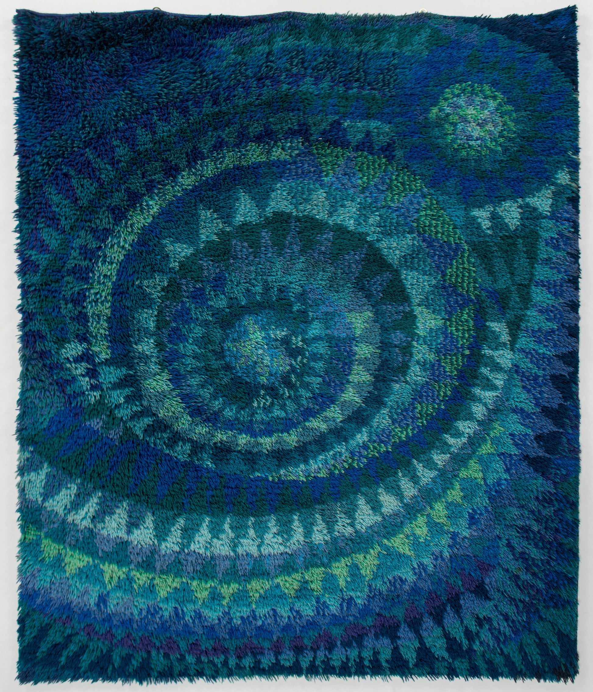 What a rug. Lay it on the floor or hang it on the wall, this little carpet is destined to make a statement. Made with the "Rya" handweaving technique, the coloration and design of this wool fringe will make you very happy. Designed by the legendary Marjatta Metsovaara, Finland's "Queen of Textiles," for Oy Finnrya Ab 1963.