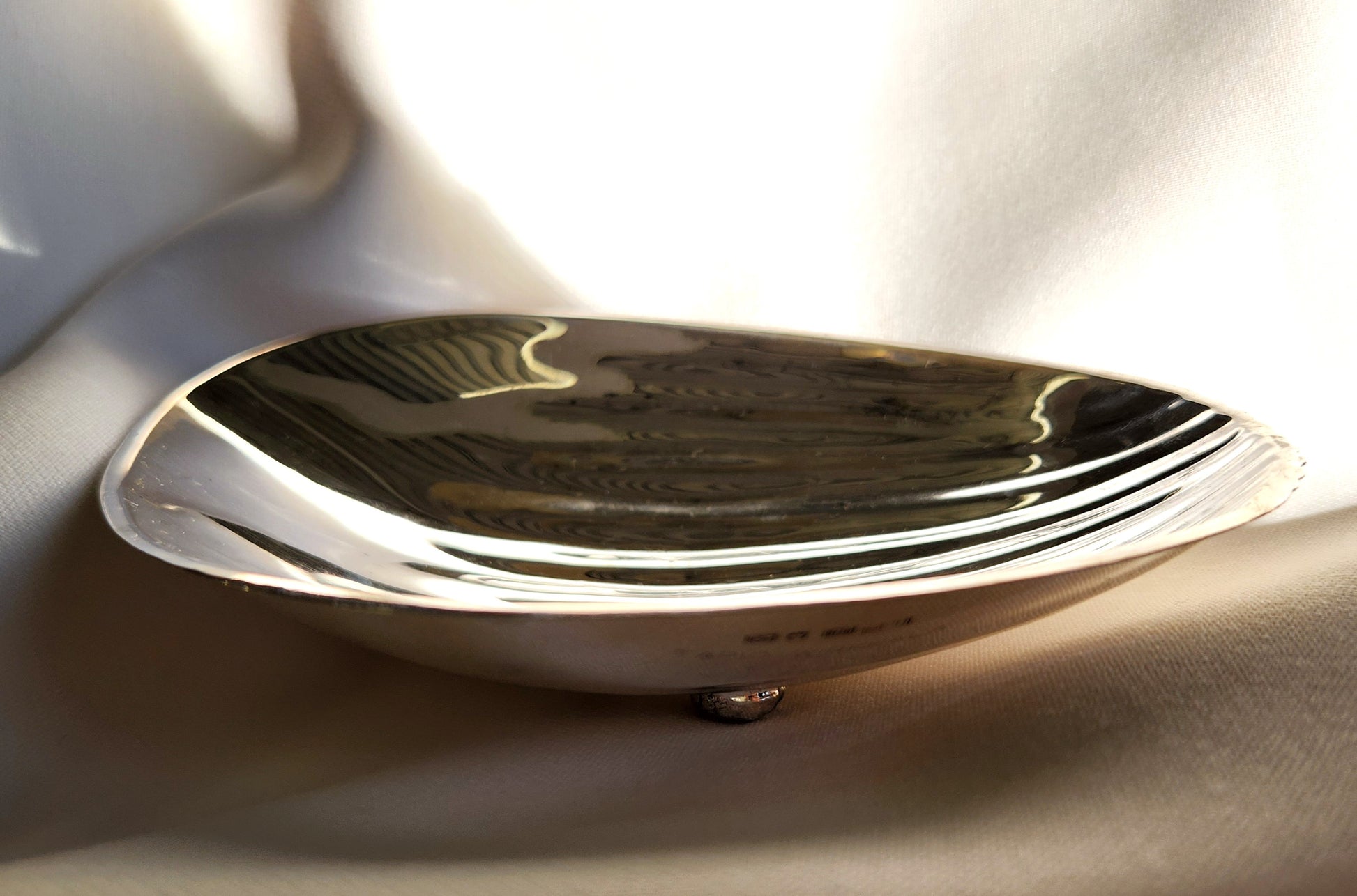 Three sweet little feet lift this precious ashtray off the table, in a subtle, beautiful way. The genius of Tapio Wirkkala is at work here, with the natural form of a seashell transformed into a work of collectible design. What a treat to look at. And 81.3% pure silver! Light as a feather.